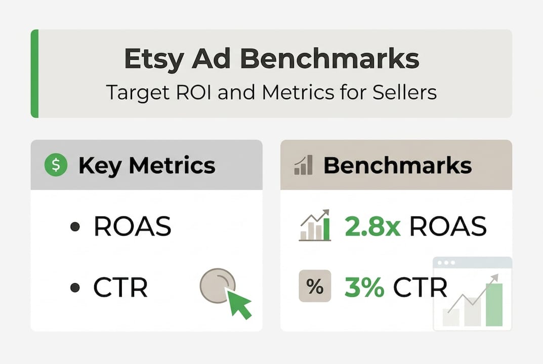 CTR averages between 1% and 3% across most Etsy categories, with 3% or above considered excellent. If your CTR falls below 1%, your main photo or title needs attention before increasing spend.