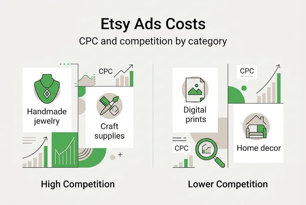 | Category type | Typical CPC range | Competition level | |---|---|---| | Handmade jewelry | $0.50 to $1.50 | High | | Digital downloads | $0.10 to $0.40 | Medium | | Home decor | $0.20 to $0.70 | Medium | | Personalized gifts | $0.60 to $1.50 | High | | Vintage items | $0.10 to $0.35 | Low to medium |